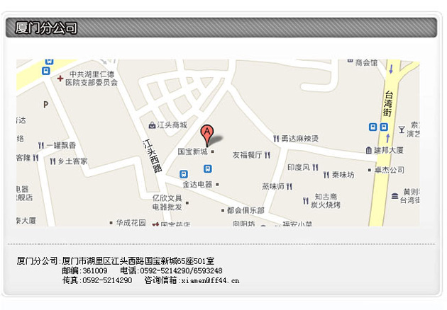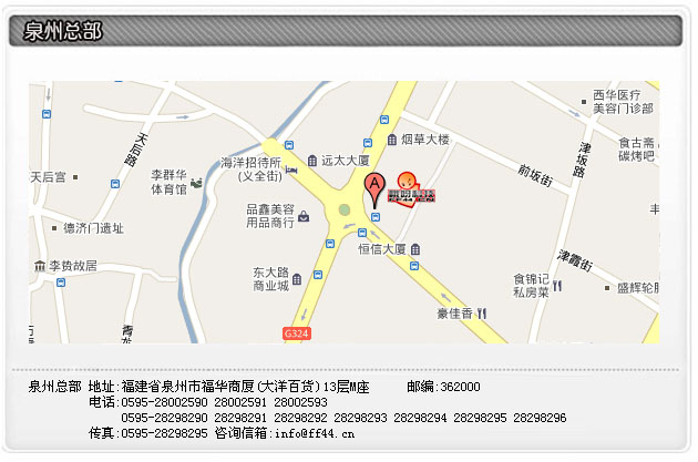 泉州总部地址:中国 福建省泉州市福华商厦(大洋百货)13层M座 邮编:362000