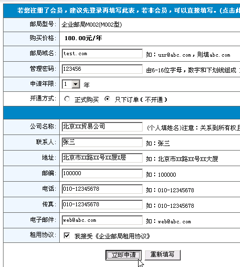 注意:如果您的会员号里有足够的款,开通方式可以选择"正式购买",这样,邮局可以马上开空,并且马上投入使用。(前提是您的域名已经正确解析到了该邮局IP )